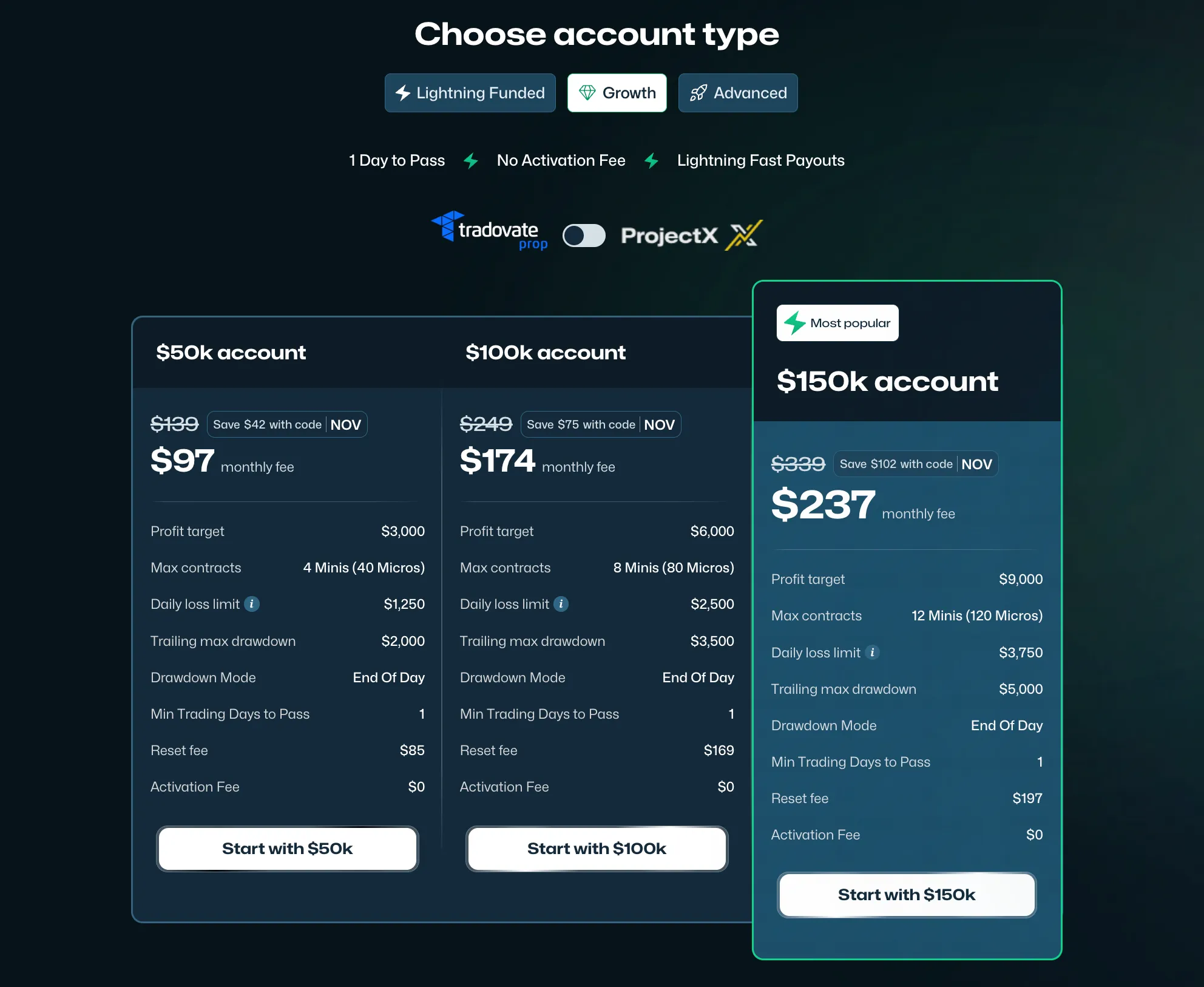 If you want realistic risk rules and a credible route to fast payouts, Growth is the Tradeify account that won’t fight your edge. You’ll pay more each month, but EOD trail + soft DLL + quick withdrawals is exactly what helps disciplined traders cross the line—and keep the account.