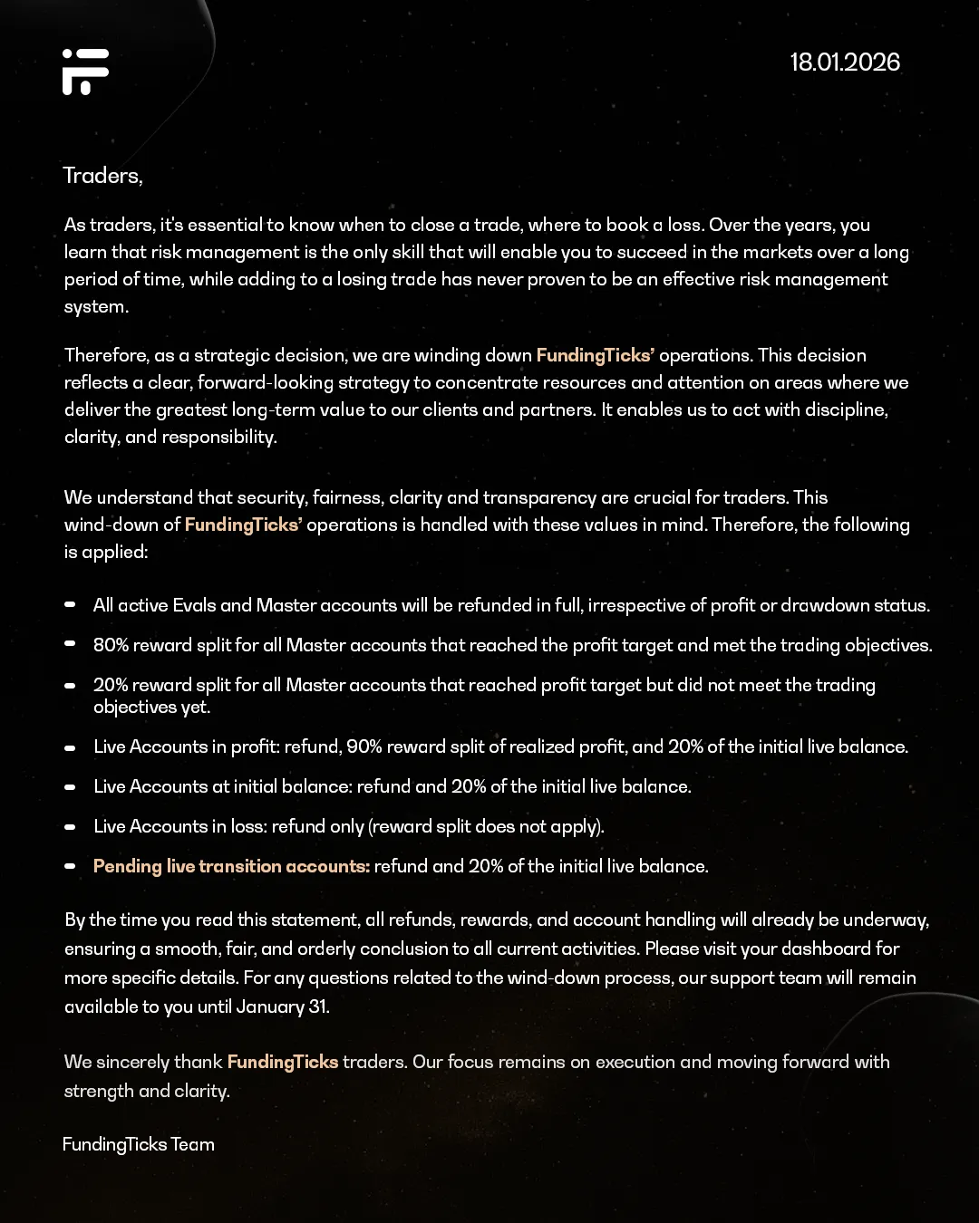On January 18, 2026, FundingTicks announced a full wind-down of its prop trading operations, citing internal risk management decisions and long-term strategic considerations.