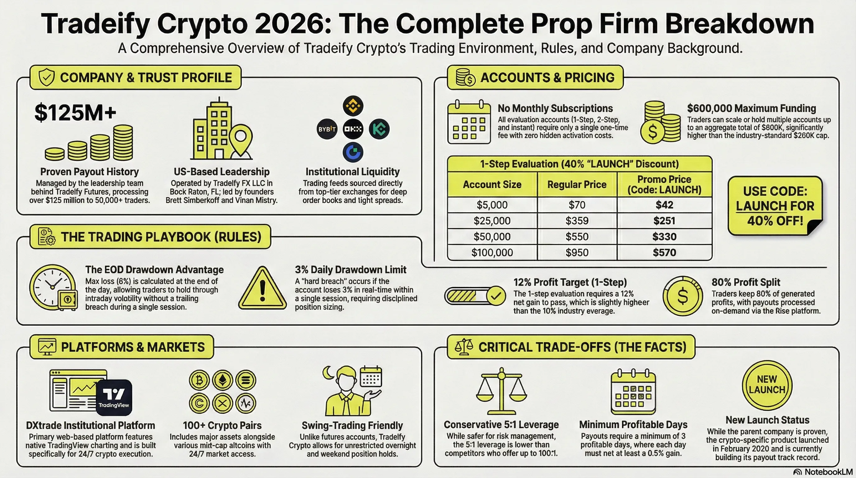 At launch, Tradeify Crypto is running 40% off all accounts with code LAUNCH (valid through February 28, 2026). For the 1-step evaluation, that puts the $5K account at just $42 (regularly $70) and the $25K at $251 (regularly $359). Every account is a one-time payment with zero activation fees.